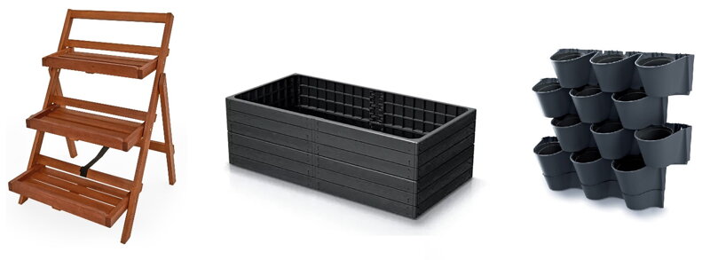 Stânga – pliabil suport de podea pentru ghivece de flori, În mijloc – pat înălțat din plastic antracit iar pe dreapta – ghivece de flori în cascadă pe perete (pentru flori sau ierburi)