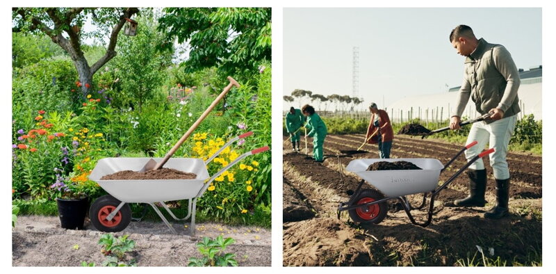 La stânga – 100 l roaba din plastic cu capacitate de transport 150 kg, pe dreapta – 75 l cărucior de plastic cu basculare și capacitate de încărcare de până la 300 kg (150 kg când este pliat)